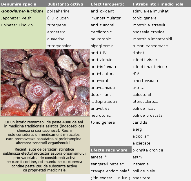 Substanta activa: polizaharide, coriolan, triterpenoide, steroli.
